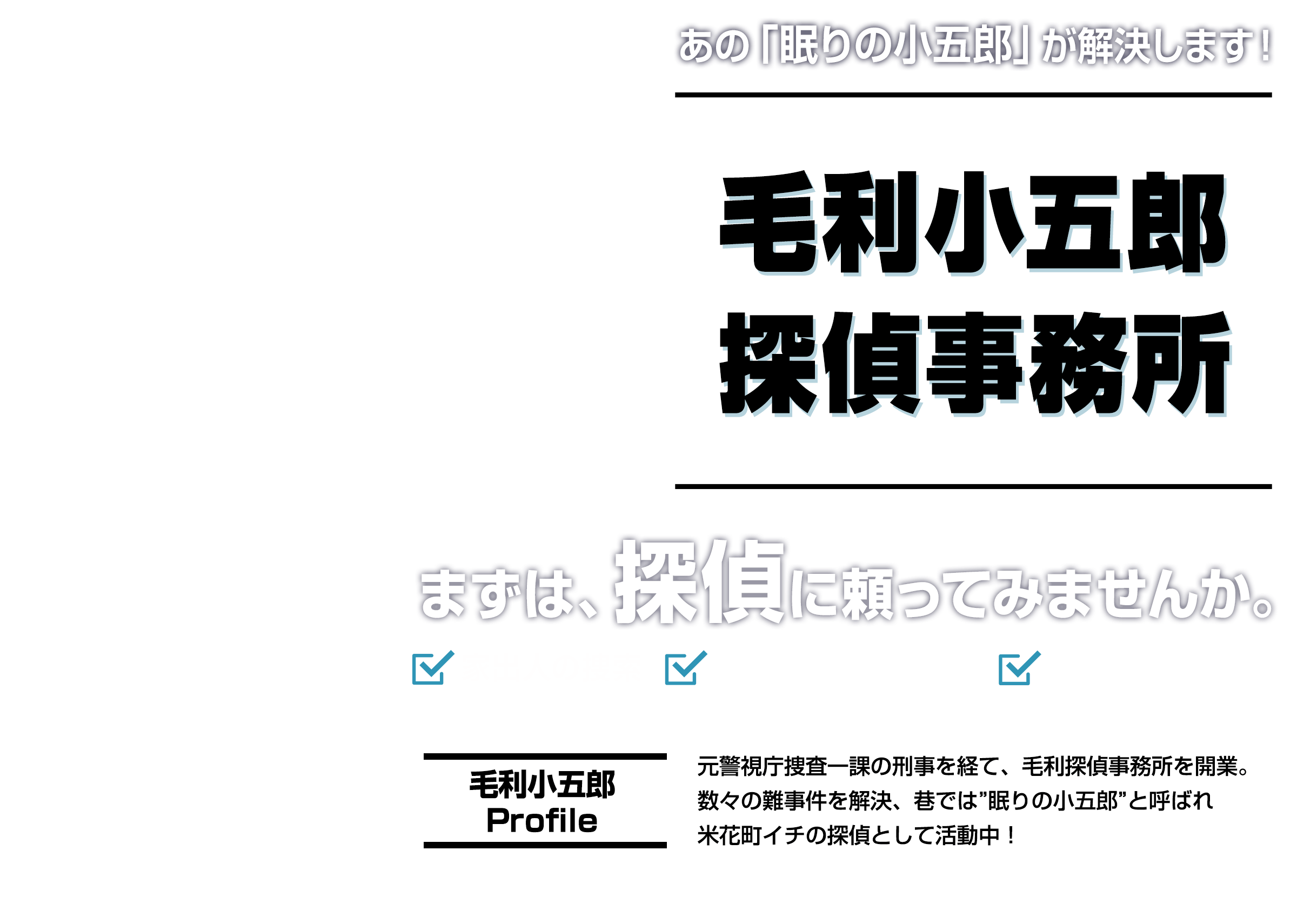 毛利小五郎プロフィール:元警視庁捜査一課の刑事を経て、毛利探偵事務所を開業。数々の難事件を解決、巷では”眠りの小五郎”と呼ばれ、米花町イチの探偵として活動中!