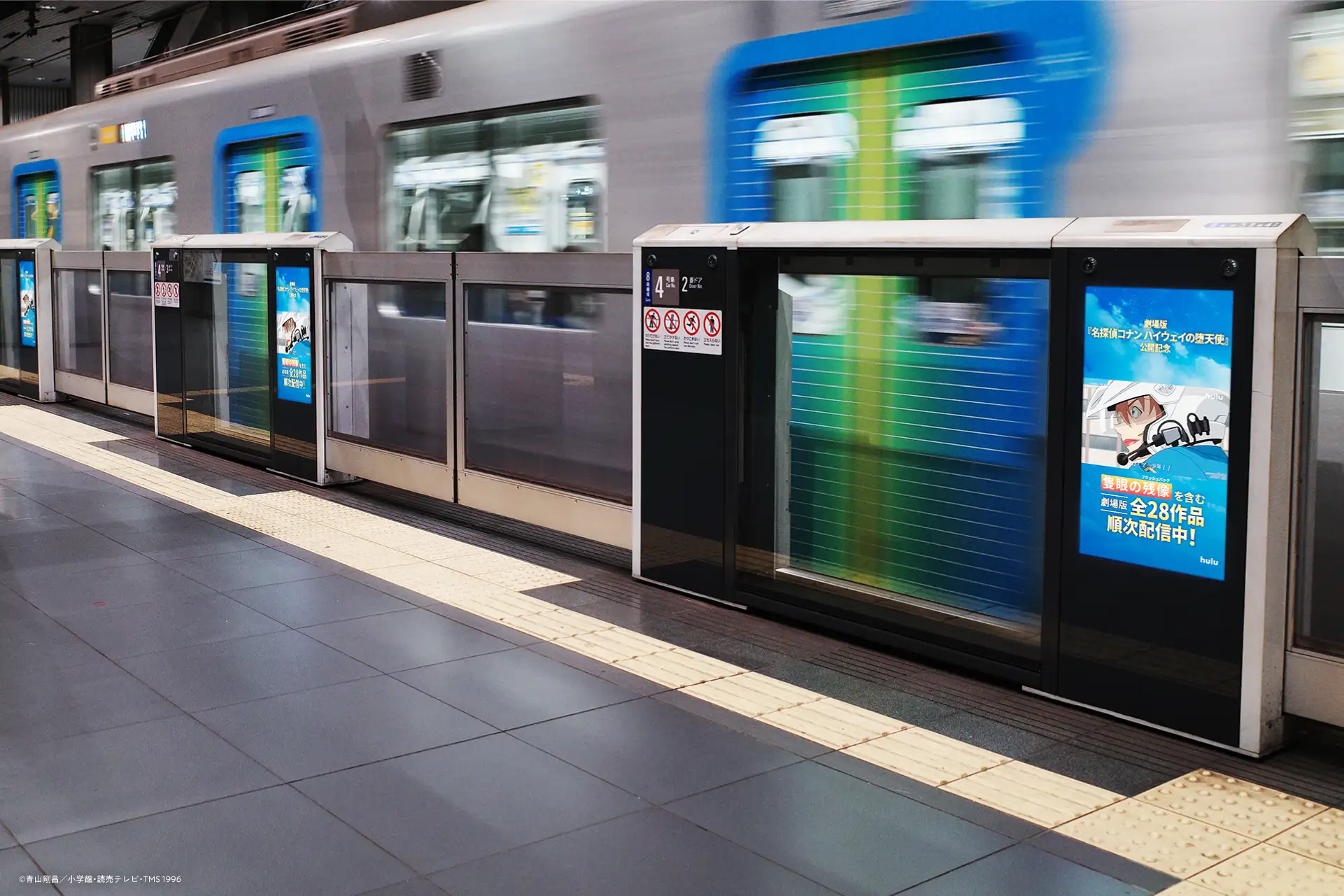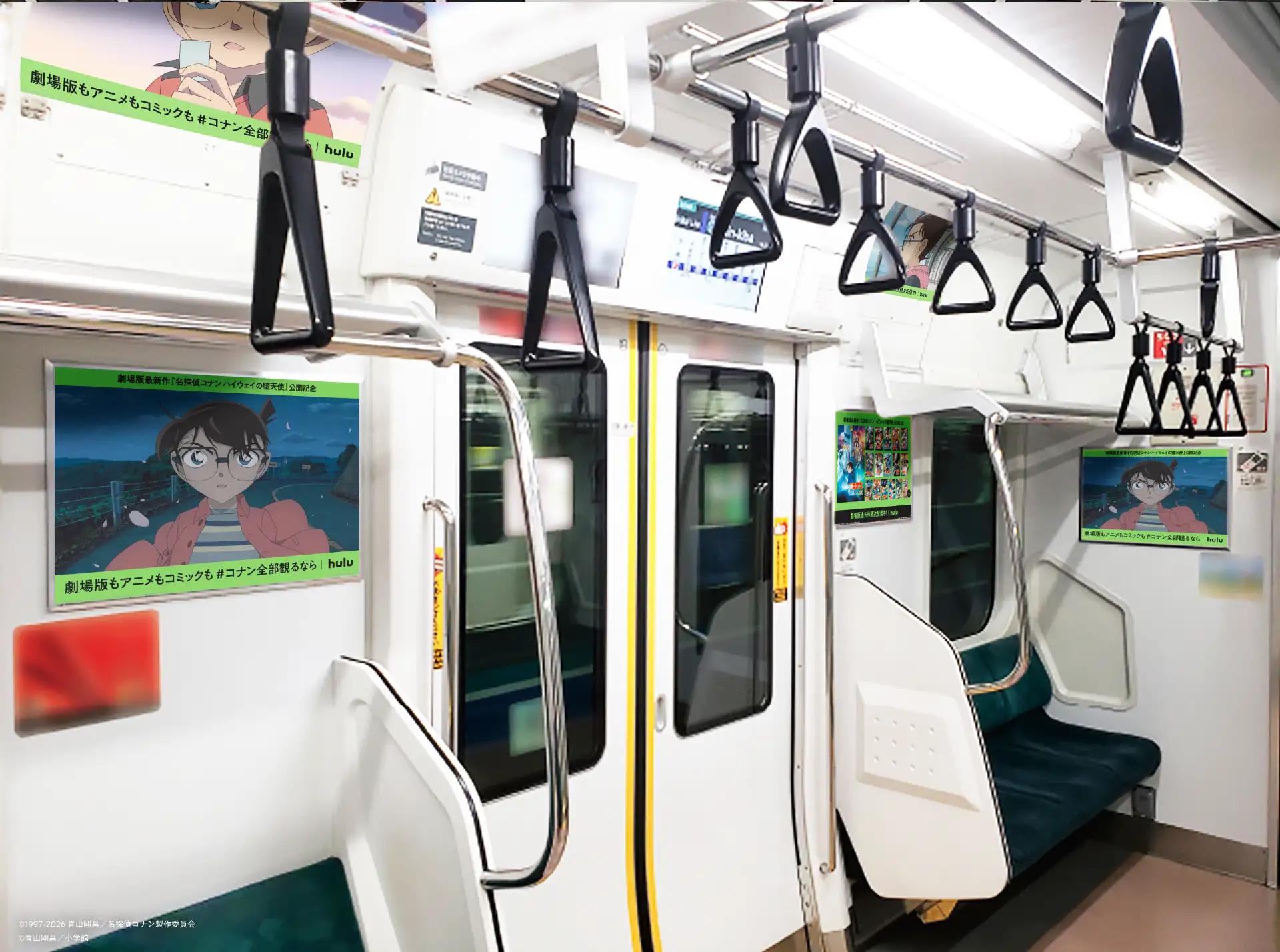 最新作の舞台である横浜へと続く京浜東北線を、萩原千速×江戸川コナンが完全ジャック。車内の中づり、ドア横、ビジョンにいたるまで、車内すべてが二人の共闘や名場面など”旋風”を感じるシーンで埋め尽くされます。