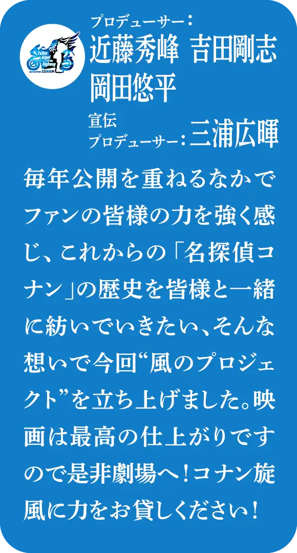 プロデューサー:近藤秀峰、吉田剛志、岡田悠平/宣伝プロデューサー:三浦広暉◆毎年公開を重ねるなかでファンの皆様の力を強く感じ、これからの「名探偵コナン」の歴史を皆様と一緒に紡いでいきたい、そんな想いで今回“風のプロジェクト”を立ち上げました。映画は最高の仕上がりですので是非劇場へ!コナン旋風に力をお貸しください!