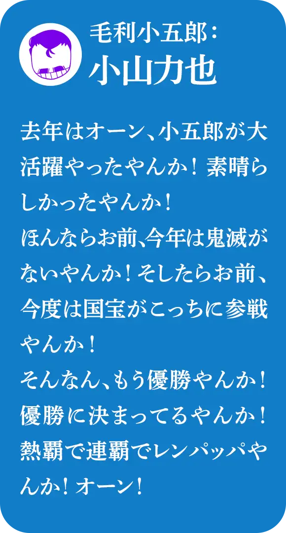 毛利小五郎:小山力也◆去年はオーン、小五郎が大活躍やったやんか!素晴らしかったやんか!ほんならお前、今年は鬼滅がないやんか!そしたらお前、今度は国宝がこっちに参戦やんか!そんなん、もう優勝やんか!優勝に決まってるやんか!熱覇で連覇でレンパッパやんか!オーン!