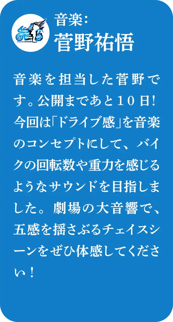 音楽:菅野祐悟◆音楽を担当した菅野です。公開まであと10日!今回は「ドライブ感」を音楽のコンセプトにして、バイクの回転数や重力を感じるようなサウンドを目指しました。劇場の大音響で、五感を揺さぶるチェイスシーンをぜひ体感してください!