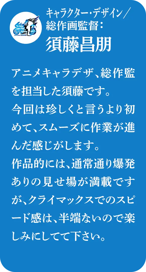 キャラクターデザイン・総作画監督:須藤昌朋◆アニメキャラデザ、総作監を担当した須藤です。今回は珍しくと言うより初めて、スムーズに作業が進んだ感じがします。作品的には、通常通り爆発ありの見せ場が満載ですが、クライマックスでのスピード感は、半端ないので楽しみにしてて下さい。