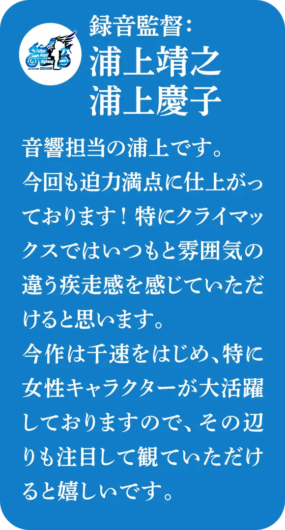 脚本:大倉崇裕◆脚本を担当した大倉崇裕です。公開が迫ってきて、一人のコナンファンとしてもワクワクしています。とにかくスピード感を大事にしました。コナン、千速たちと一緒に神奈川を駆け抜けて、見終わった後はスカっと爽快な気分になっていただければと思っています。
